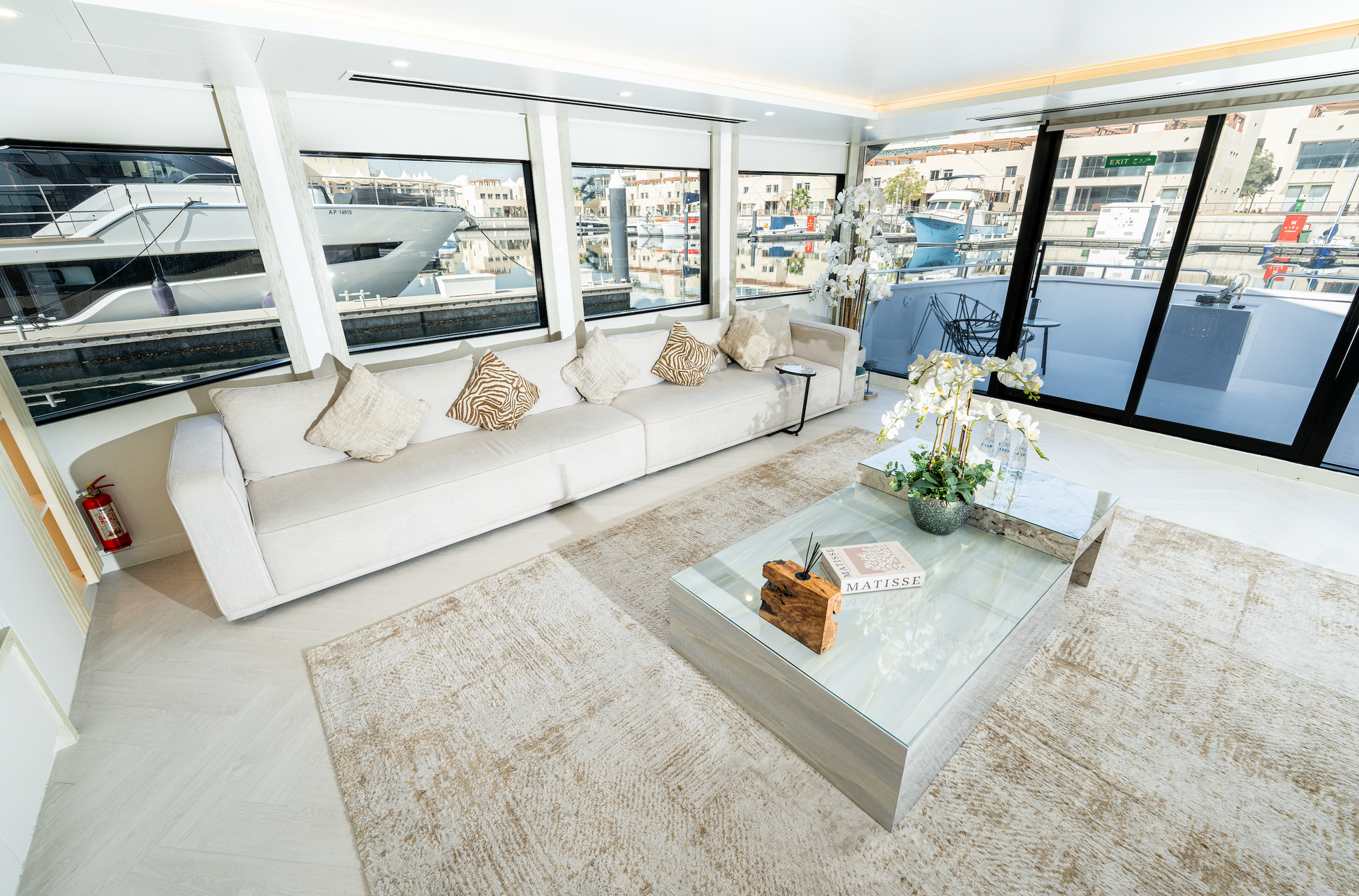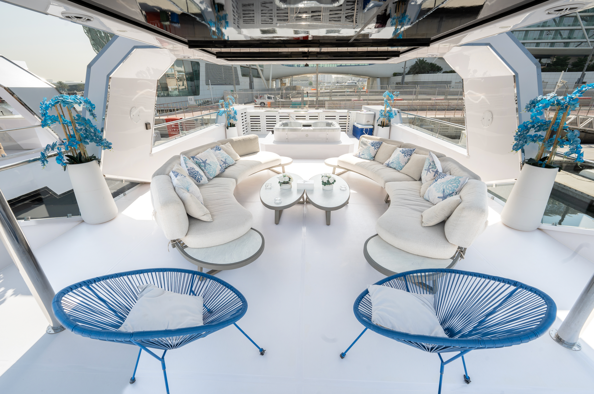 - Protection: Specialized UV-treated glass and high-end coasters/placemats provided to ensure the integrity of the yacht's designer surfaces.